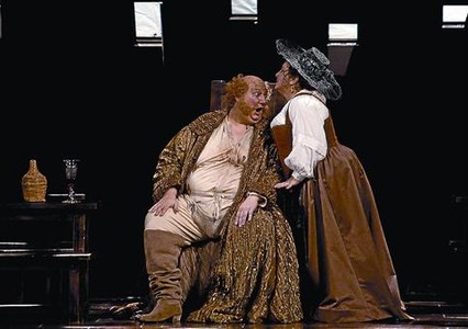 Ambrogio Maestri (Falstaff) i Elisabetta Fiorillo (Quickly) en la primera escena del segon acte de la producció de Peter Stein. Liceu 2010 Foto El Periódico