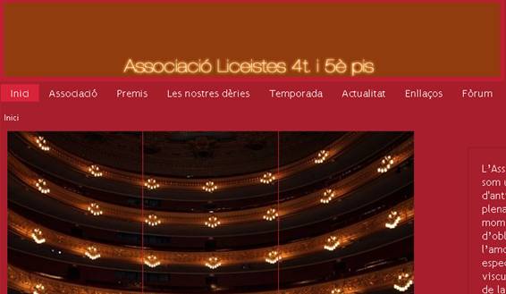 L’Associació de Liceistes de 4t i 5è pis, de la qual ja sabeu que en formo part, ha confeccionat una pàgina web on hi podreu trobar reflectides les activitats que aquesta associació du a terme, així com un mica de la seva llarga història i apartats d’opinió dels seus membres, al voltant de les activitats del Gran Teatre del Liceu i de l’activitat cultural de Barcelona.