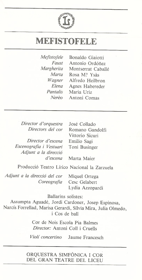 He volgut portar-vos aquesta representació ja que alhora que us portava un altre títol, em permetia fer-vos conèixer a Bonaldo Giaiotti, un eminent baix que potser molts de vosaltres no n’heu sentit a parlar, però que per sort varem veure molt al Liceu i que degut a que no va entrar quasi mai en els circuits més comercials de les gravacions, per a molts ha estat injustament desconegut. Amb aquestes representacions de l’any 1987 Giaiotti era la tercera vegada que interpretava aquest rol al Liceu. La primera vegada ho va fer amb Elena Mauti Nunziata de Margherita i Joan Lloveras de Faust a la temporada 1976/77, la segona vegada va ser amb Natalia Troitskaia i Luis Lima a la temporada 1981/82 i aquestes amb Caballé i Antonio Ordoñez va ser la tercera. Encara tenia una veu prou solida, tot i que es començaven a notar els efectes del pas dels anys, però jo crec que el Mefistofele de Giaiotti, seguint la gran tradició dels baixos italians, era la millor possible dels baixos de la seva època.