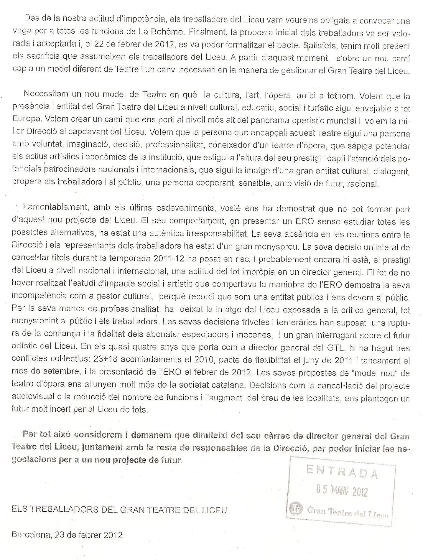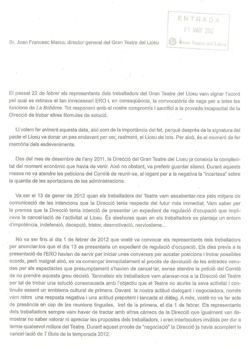 LICEU: ARA LA CARTA DELS TREBALLADORS A JOAN FRANCESC MARCO