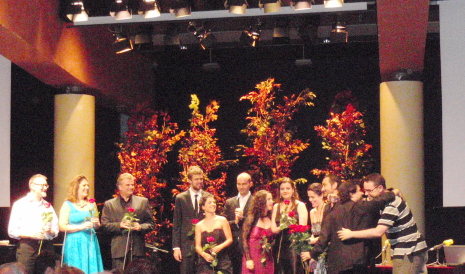 El tercer blog era la gran sorpresa del programa, i no va ser altre que la intervenció de Sondra Radvanovski i Marcelo Giordani acompanyats al piano per Mark Hastings. Radvanovski, vestida quasi com Olivia Newton John a Grease (i nja no té edat) va cantar de manera sensacional el “Vissi d’arte” de Tosca, cosa que fa augurar unes Aides de impacte, mentre que Giordani va oferir-nos l’ària de Rodolfo de Luisa Miller, de manera poc ortodoxa per a ser políticament correctes, ja que es tractava d’un regal en una festa d’aniversari no entraré a sac. Tots dos encara van cantar el fragment final del duo de l’acte primer de Tosca, òpera que per cert la senyora Radvanovsky sembla que ha dit que vindrà a cantar al Liceu, igual que Norma, però primer la cantarà a Peralada.