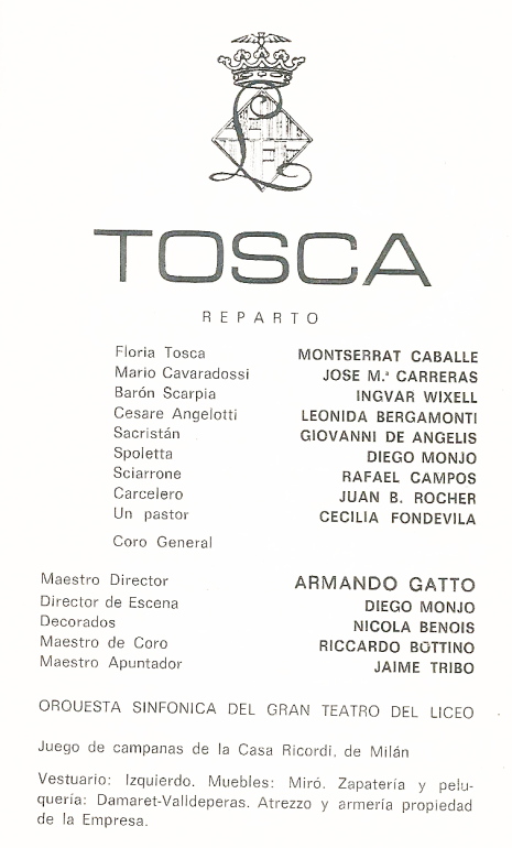 Per qüestió d’edat, els meu primer Carreras va ser molt anterior: el 14 de gener del 70 fent el paper de Flavio (segon tenor) a la Norma de la Caballé. Després el vaig veure amb Lucrezia Borgia (amb Caballé), un Faust, un Rigoletto (amb Corneil Mac Neil), una Luisa Miler (també amb Caballé) i una Traviata fins arribar la Tosca citada.