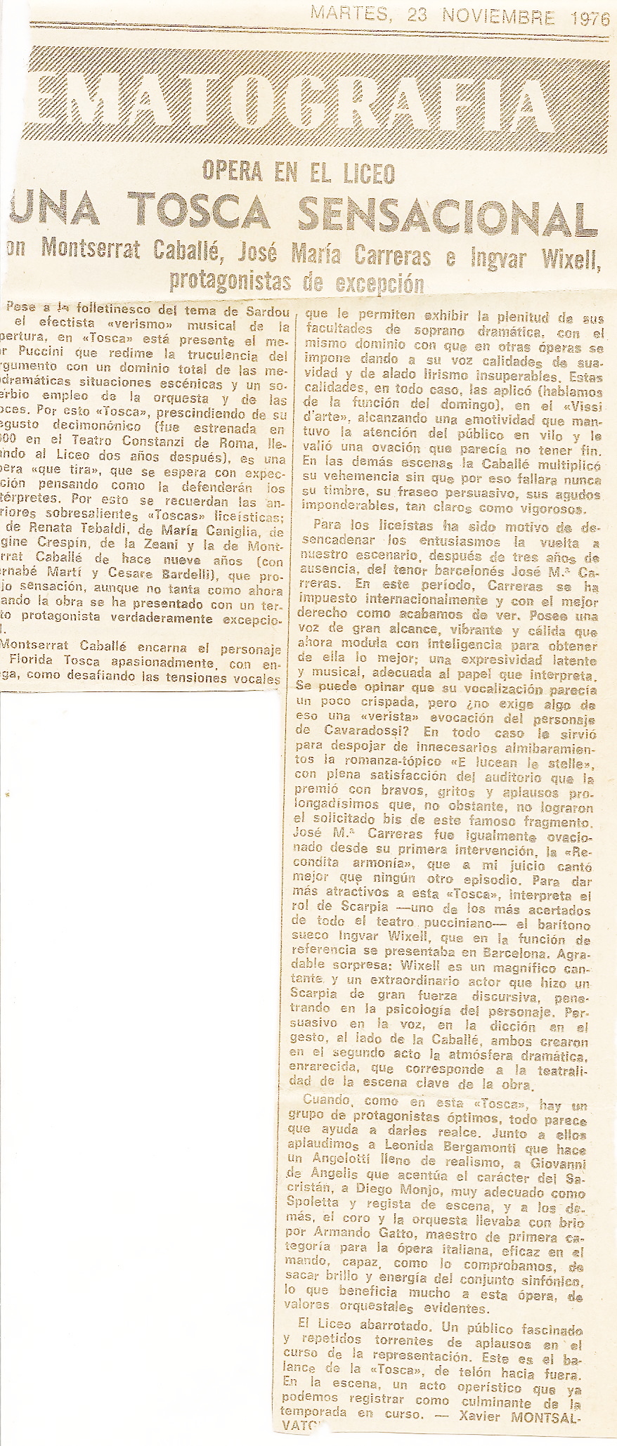 Tot sovint penso que haig de fer neteja i desfer-me dels programes del Liceu, però si ja ho hagués fet no podria il·lustrar-vos aquest apunt fins i tot amb l’entrada i el retall de la crítica que va fer Xavier Montsalvatge a La Vanguardia del dia 23 de novembre. Ho vaig guardar tot, Carreras, Caballé i Wixell, els mateixos que ho van gravar per la Philipps en una gravació per a mi referencial, em van deixar venturosament KO