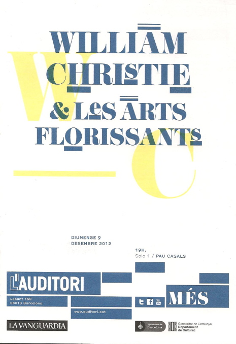 Accepto que no t’agradi la música barroca, per tant estàs descartat del concert, sense cap altre argumentació, ara bé, no em diguis que precisament del barroc no hi hagi públic, quan és un dels períodes amb més seguidors en els darrers anys. La proliferació de grups i formacions és enorme i la categoria de les mateixes és “universalment” conegut. Precisament William Christie i Les Arts Florissants són dels més reconeguts, fins i tot per a tots aquells que no són talibans del barroquisme musical.