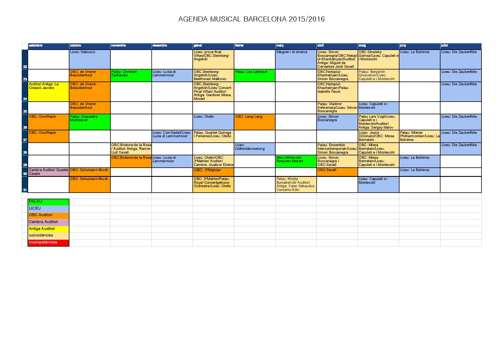 L’agenda no inclou tots els concerts dels diferents cicles del Palau o l’Auditori, però si els més importants. No volia que el document fos feixuc i difícil de llegir, amb unes caselles més farcides i per tant he intentat enllestir-ho amb dos folis per fer-ho més pràctic i manejable.