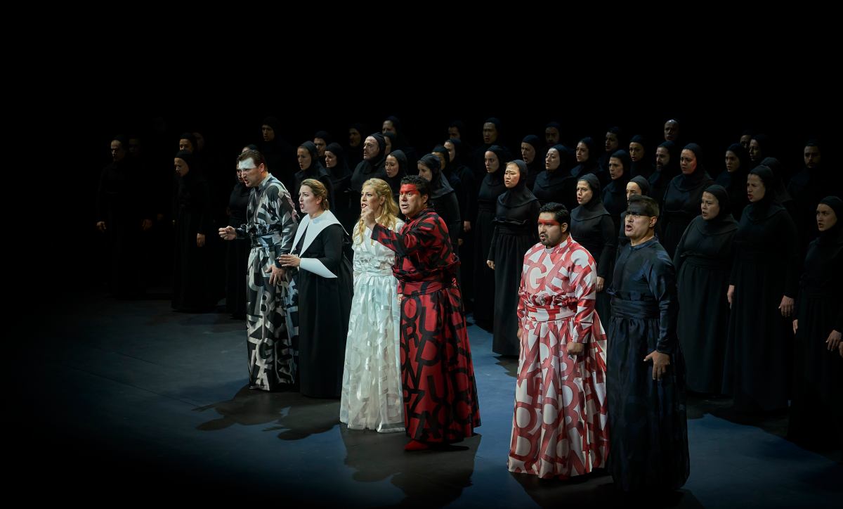 Francesco Pio Galasso, Gemma Coma-Alabert, Sondra Radvanovsky, Luca Salsi, Fabian Lara i Erwin Schrott. Foto de David Ruano, gentilesa del Departament de Premsa del Gran Teatre del Liceu