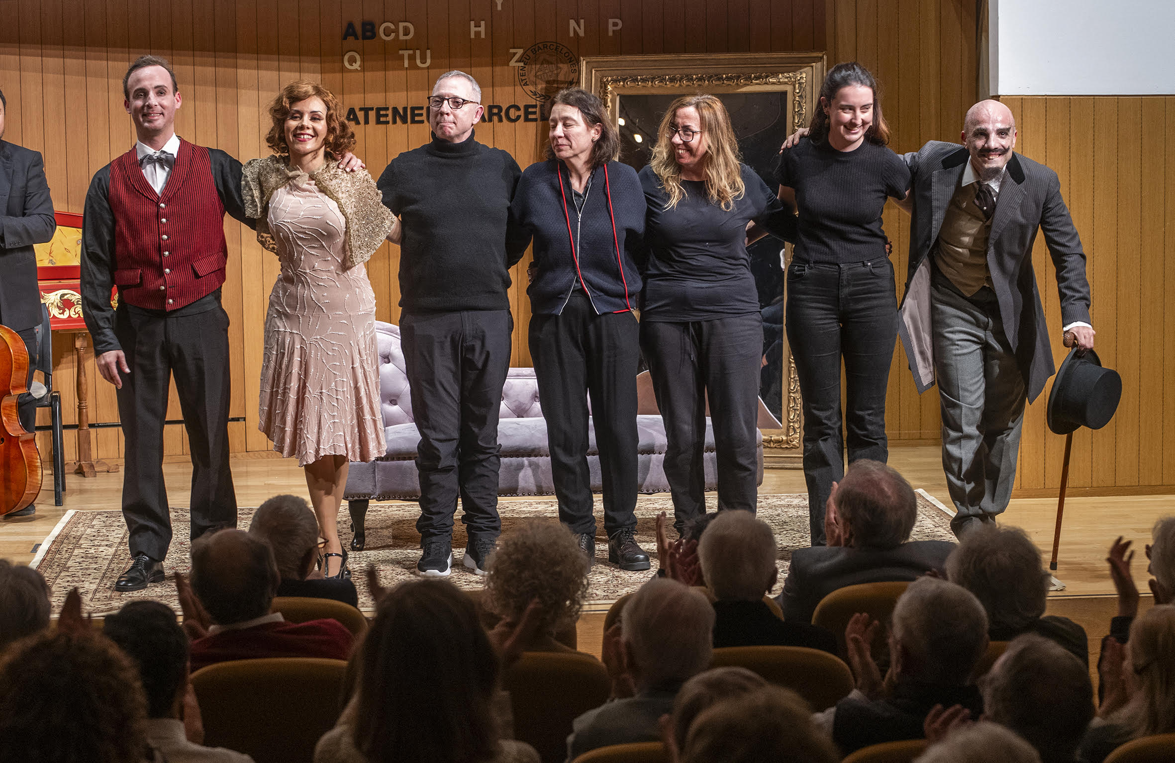 Salutació final de La Serva Padrona de Pergolesi a L’Ateneu Barcelonès, 17 de desembre de 2025. Jaume Sangrà, Mar ESteve, Miquel Gorriz, Núria Cardoner, Kiona Vioque, Gloria Nogué i Manel Esteve. Fotografia d’Antoni Bofill gentilesa del departament de premsa d’AprÒpera